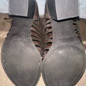Step up your shoe game with our sophisticated Sugar peep toe ankle boots, available in size 9.5. These stylish boots come in a versatile chocolate brown shade, crafted with a luxurious material that offers both durability and comfort. The intricate lattice-like cutouts and lace-up front lend a classic yet contemporary look, with peep toe detailing that adds a hint of flirtatious charm. The chunky heels provide stable elevation, perfect for enhancing your silhouette. These boots are designed to zip up at the back, ensuring a secure and snug fit. Ideal for transitioning from day to night, they will complement any outfit, whether it's a casual brunch ensemble or an evening attire. Add these exquisite boots to your collection today and enjoy the perfect blend of fashion and function.