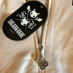 Sugar & Babe woman’s cropped cat hoodie. Front silver tone zipper with logo pull, heat sealed cat face on back, hood with cat ears, logo on left front chest, secure knit ribbing around waist & cuffs.