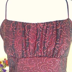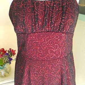 Red sparkles on black sheer fabric over a red lining. The look is a dark red, and very dramatic! Spaghetti straps, built in bra, ruched chest. Wide waistband. Full skirt. The red lining has a net layer at the bottom