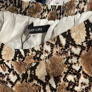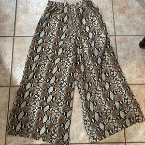 Size small brown, white and black wide legged “palazzo” pants from Sugar Lips. Straight waist in the front and elastic in the back. Lined in cream polyester to the knee. Very comfy and yet professional and stylish.