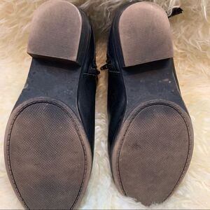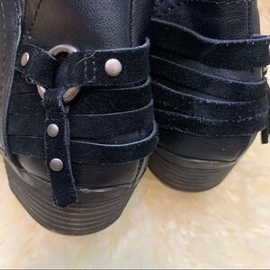 Fun and slightly edgy black ankle booties from Sugar. Suede straps and silver tone bit on back. Ankle zip. Low heel, very comfortable. Some scuffing at toes.