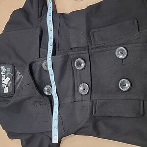 Sugarfly Size S, Black Double Breasted Pea Coat, Wool Blend. Gently Used Condition. Missing one button at top (under collar). Please refer to measurements in photos to ensure proper fit.