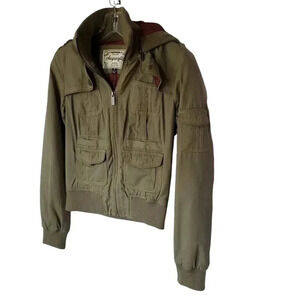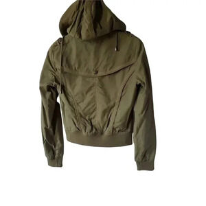 This stylish, lightweight jacket is perfect for the upcoming season. Gently used, excellent condition. The jacket has a removeable hood (zipper). The jacket is olive green on the outside, and a deep burgundy color on the inside. There are lots of pockets throughout the jacket. There are one missing buttons, one on the front-left, bottom pocket,the stitch from the left pocket is gone a bit Although the jacket size reads Small, it's a smaller, tighter-fitting jacket and could fit into the XS category.smoke and pet free.0150