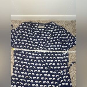 It is in good condition. It has stains that I think can be washed. It is perfect for maternity or nursing wear. It is a charming top with a white elephant print on a blue background.