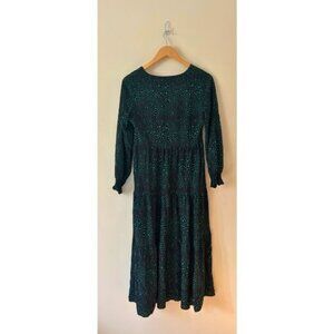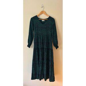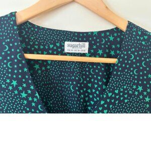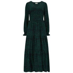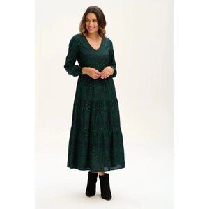 Stand out in the stunning Sugarhill Nola V-Neck Tiered Maxi Dress in black and green, featuring a charming Star Polka Patchwork design. This unique piece from an independent UK brand is perfect for the festive season or any special occasion. The flattering tiered silhouette and playful print make it a true statement party dress.
