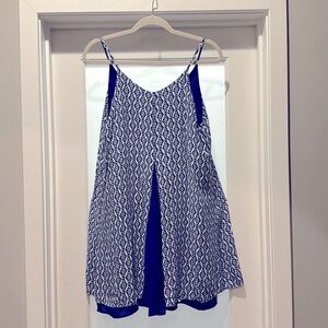 Lightweight and easy to wear Sugarlips sleeveless dress in a blue and white geometric print. A-line fit with flow and movement. Great for summer, vacations, brunch, or warm weather layering.