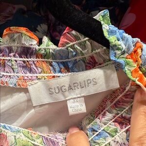 Colorful top with ruffle details. Perfect for a vibrant look.