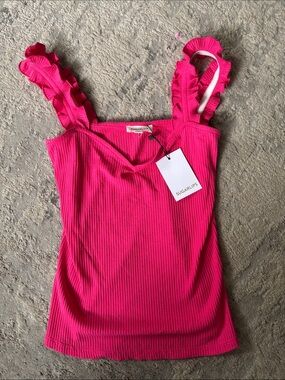 Ribbed tank top in bright fuchsia. Ruffle shoulder straps add feminine detail. V-neckline flatters the bust. Stretchy knit for a comfortable fit. Easy to style for day or night.