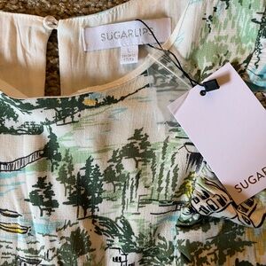 Elegant dress with a villa inspired print. Features a soft, flowing design. NWT