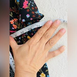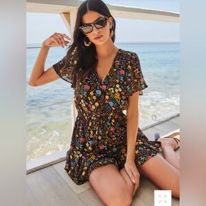 Flowerbeds under a moonlit sky. This bold floral print features various flower clusters that pop against a black ground to shape the evergreen, Babygirl Romper. Short flutter sleeves frame a surplice neckline, where it meets an elastic waistband with a drawstring. Flowy godet shorts complete the style and can easily be paired with black or fun colored heels for a finished look.