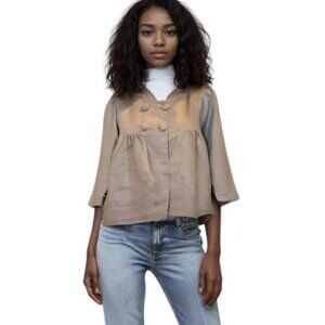 Love this stand-up collar suede like jacket. It is brown in color and has buttons on the front. There is also an inside button at the neckline. The sleeves are bat wing that have a slit at the hemline for easy moving. The back is slightly longer than the front. It is a swing jacket that swirls as you twirl! It feels as though you are wearing a suede jacket. Comfortable decorative pretty lining. Wear at the office or for an evening out.