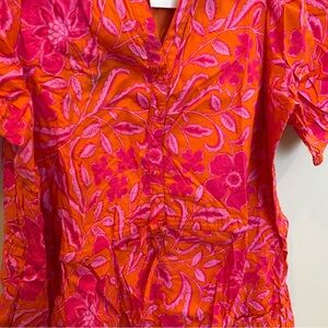 The Rea Floral Stacie Button Down Mini Dress has the perfect combination of orange and fuchsia florals throughout. Lightweight cotton fabric that has button down style with fitted bodice, and short half sleeves with elastic cuffs. A flirty ruffle hem finishes off the look and can be paired with heels.