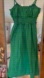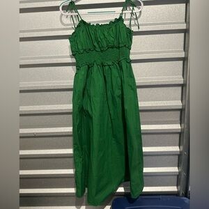 green midi dress. Features thin shoulder straps that tie at the back, a smocked bodice, and a ruffled neckline.