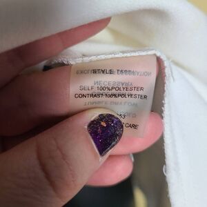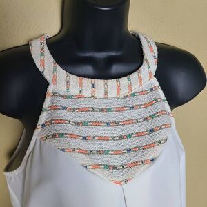 This is a white halter top by Sugar Lips. It has multicolored embroidery on the cheat, back, and straps. On the back is a dual clasp closure which creates a keyhole detail. Note spots as shown in photo 4.