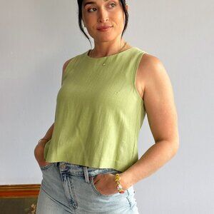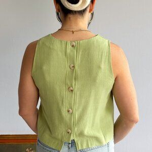 Lightweight, effortless, and undeniably chic — the Sugarloaf Top in green linen is your summertime essential. Designed to pair perfectly with the Wide Leg Linen Palazzo Pants, this sleeveless tank top is a nod to clean Parisian styling with a playful twist. Crafted from ultra-soft, breathable linen, it features a flattering high neckline, a subtle A-line shape, and a full button-back closure that adds a dose of charm. Wear it as a set or style it solo with denim, linen trousers, or a flowy skirt. Whether you're brunching in the city or jetting off to the coast, this top is as versatile as it is refined. Details: 70% rayon, 30% linen Green Tank top Button down back Boxy fit Bust darts Feels soft Bra friendly Matching pants sold separately Size & Fit: The Sugarloaf Top fits true to size. The fabric is soft and does not stretch. Iy has a boxy fit, perfect for pairing with all of your favorite bottoms. Refer to the measurements below and choose your perfect fit. XS - Chest: 32", Length: 17" S - Chest: 34", Length: 18" M - Chest: 36", Length: 19" L - Chest: 38", Length: 20" The model is wearing size medium. Model: 5'5, 140lbs, 35" chest, 28" waist, S/M/6/8