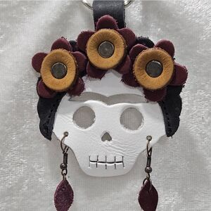 Measures 3 1/8 without the earrings and 4 inches from ring to bottom of skull.