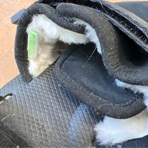Closed toe with open heel Adjustable hook and loop back and front straps Shearling lined Not new, have been worn. Minor imperfections, discoloration and wear. In overall very good condition