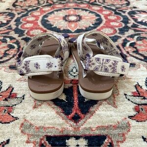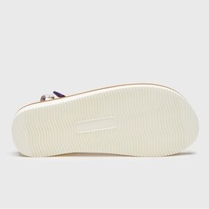 Stylish Suicoke sandals with purple and white pattern. Comfortable footbed. Adjustable straps.