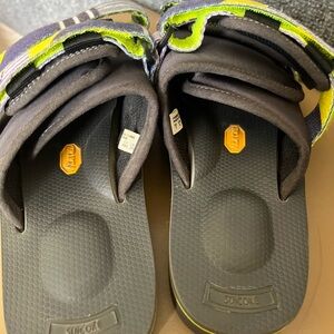 Vibrant Suicoke sandals for kFeatures black base with yellow and purple accents. Ideal for playful outings.