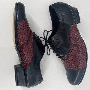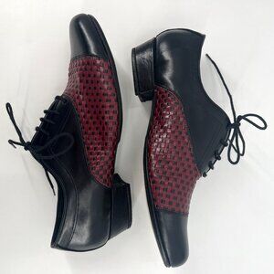 Absolutely gorgeous shoes handmade by Suipacha 256 Tango in Argentina. Label on bottom even includes the name of the person who made them - Norma Gomez. Suipacha Tango has since closed its doors, so these are impossible to get in the USA and even in Argentina now. So beautifully made with the cap toe and burgundy and black woven uppers. Suede leather sole to lightly grip the dance floor, but let you glide effortlessly. 1.5" heel.