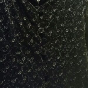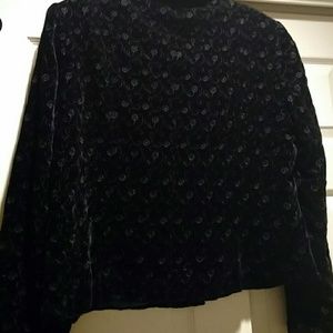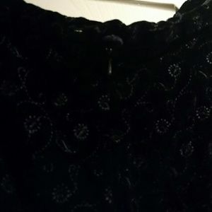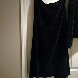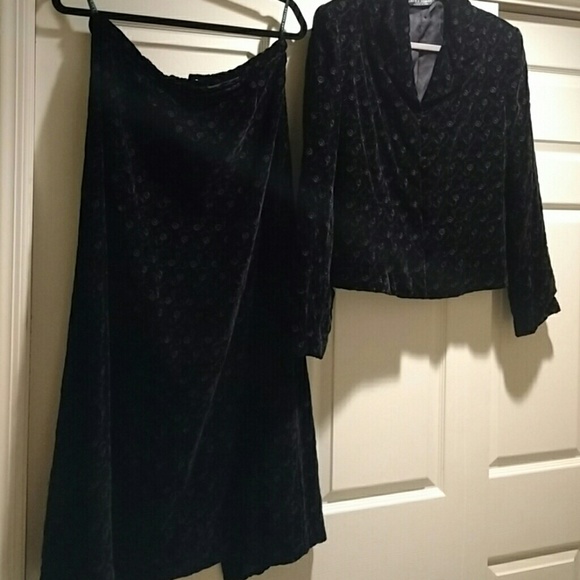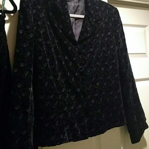 Woman's velvet jacket with velvet buttons, midi back zippered, slit in back of skirt. The skirt measures 16 1/2 inches across from seam to seam and the jacket from armpit to armpit measures 22 in. This is a smoke and pet free home.