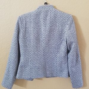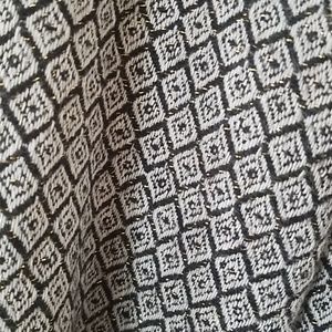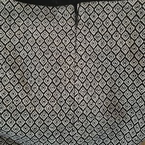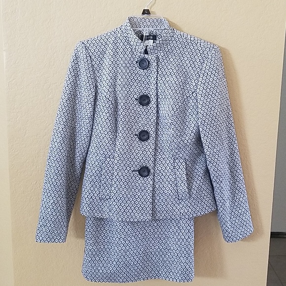 2 pc ensemble. Material has gold thread flecks throughout. Skirt is fully lined with 7" slit in back and hidden zipper. Length is 23". Waist is 30". Jacket is fully lined with mandarin collar and length is 23". Shoulder to shoulder is 16.5"