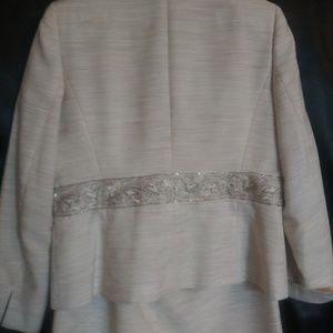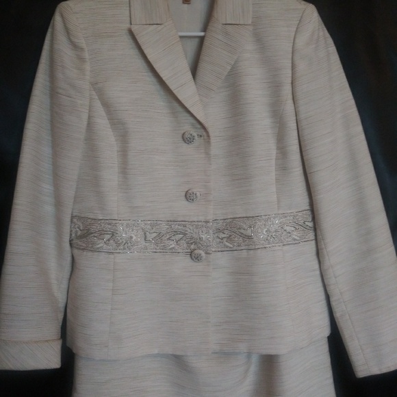 Kasper size 8 beautiful suit, main color is ivory with taupe lines through out. Embellished buttons with beautiful 2 1/4 inch sequined embellished border running through the waist area from front to the back with split sleeves to wear cuffed or not.