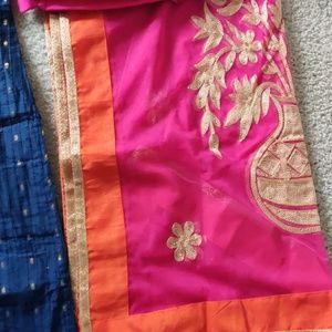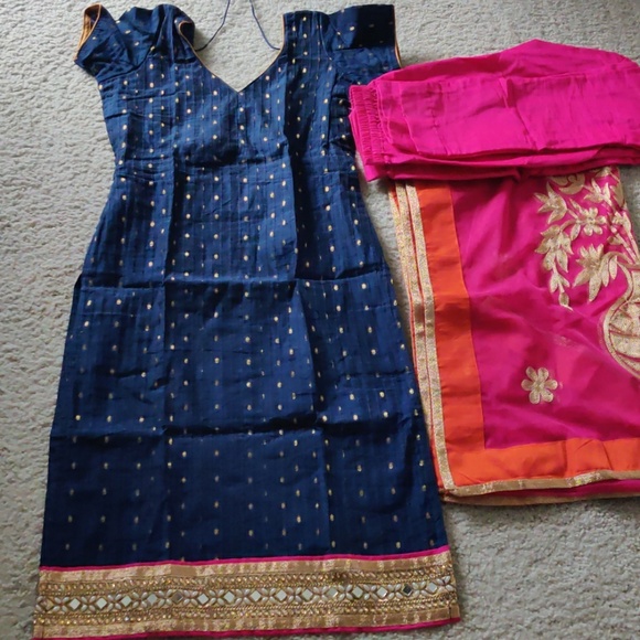 Blue in colour with a thick border near the leg region. Blue thread work full dupatta and pink coloured pants. Size of kurta 33 inches with one inch margin on both sides. Length of pants 35 inches.