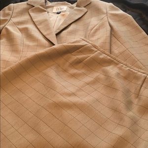 Beige LeSuit suit. Window block details throughout the jacket & fully lined skirt. Pre owned. In excellent condition