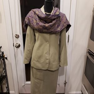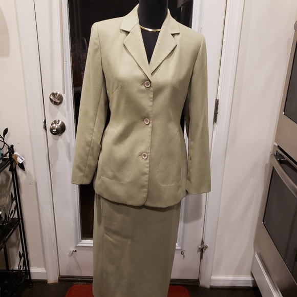 Wool skirt suit, 3-button, falls slightly below calf. Gently used.