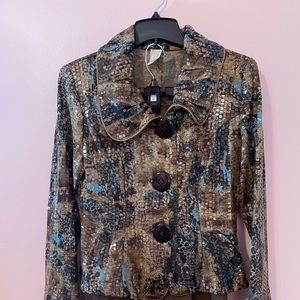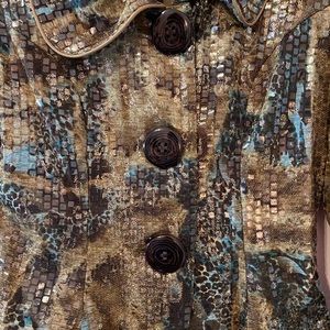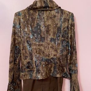 Has never been worn. A very classy brown suite with animal print and a bit of shine to it. Size is extra small but it fits like a small.