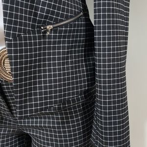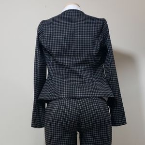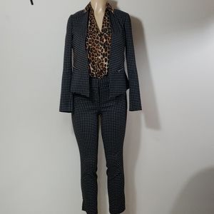 Women's 2 piece suit with blazer and ankle cropped pants. (Belt and shirt not included) Stretch material. Black with white stripe detail. Quality material. Large belt hoops. Silver zippers and no buttons on blazer. True to size. Worn once and that was when it was tried on. Gained weight before it could be worn and couldn't fit it. Buyer will not be disappointed.