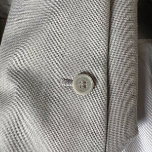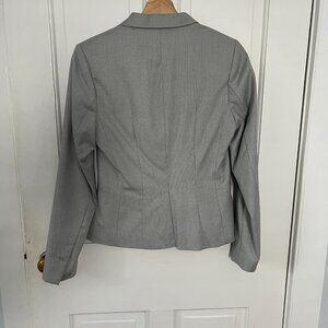 Grey suit perfect for spring/summer/fall, in woven fabric, H&M, Size 4 , like-new condition, hardly worn, one button jacket, front pockets , notched lapels, one button at cuff, fully lined, length from top of shoulder to hem approx 24 inches, width across shoulders approx 16 inches. Pants with regular waist, hook and button fastener and zip fly, belt loops, full length, slanted front pockets, fake back pockets, tapered slim leg with creases.