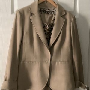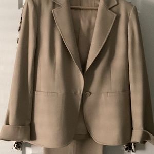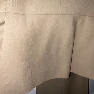 Tan, 100% wool custom tailored suit jacket. Suit has nice lapels, a one button closure, cuff sleeves, and has double vented on the back. The suit is 100% lined. This suit is for the one day when business casual simply is not enough. It is for the day when you accept your big promotion in the corner office.