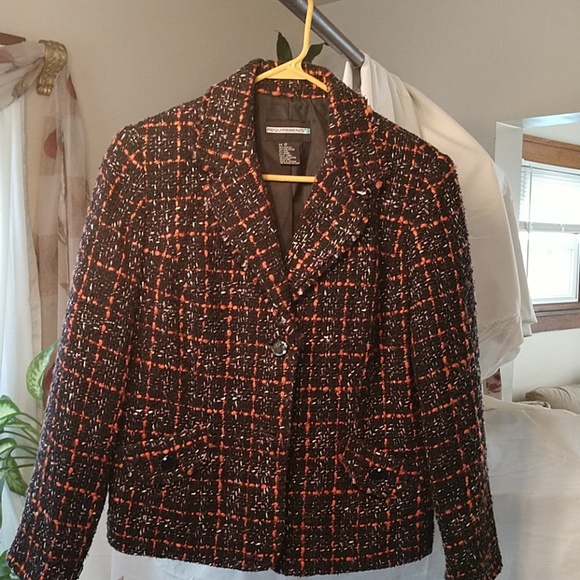 Black jacket with orange, white, lavender & purple Tweed with black accent button