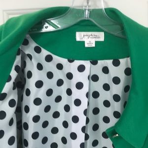 Green jacket with beautiful polka dot lining, bell sleeves, missing one button so priced accordingly