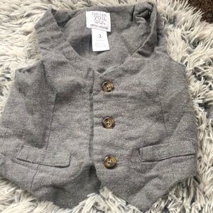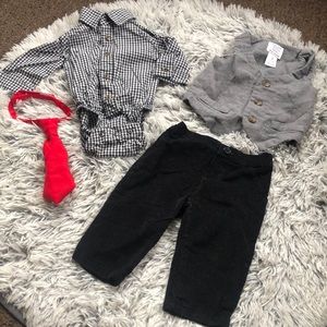 His set comes with a button up onesie. A Velcro tie, a vest, and corduroy type of bottoms. There are faux pockets on the pants and jacket. This outfit was worn once for professional photos.