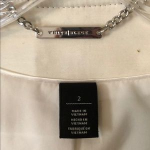 White skirt and jacket that is great for business meetings or work. Has black stitched striped throughout fabric. There is a small stain on the skirt that can come out at with dry cleaning. Coat is a 2, skirt is a 0.