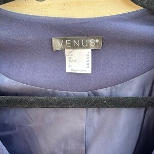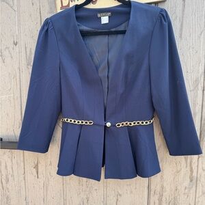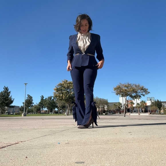 Venus pant suit set. Navy blue jacket and pants with cute bow detail. Show up to any event with some flare. Bottom of pants are open to show off just a little bit of leg