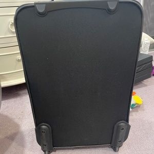 About 20inch suitcase, not as big as a checked bag, more of a overhead-carry on size. Has 2 wheels and handle strap and pull out handle. perfect condition. Great space inside.