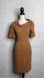 This elegant camel brown sheath dress is a timeless piece that combines sophistication with understated charm. it provides a tailored silhouette that flatters the figure effortlessly. The dress features a unique asymmetrical cowl neckline, adorned with an eye-catching bow detail on one side, adding a touch of refined femininity. Its elbow-length sleeves offer a polished look, making it suitable for professional settings or formal events. The fitted waistline, highlighted with subtle horizontal seams, enhances the natural shape while creating a streamlined aesthetic. Falling just below the knee, this dress delivers a classic midi length that exudes poise and grace.