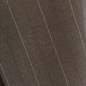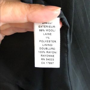 Black pinstripe wool suiting jacket from BR. One front button, two front hip pockets (one is functional, one faux). Generous length.