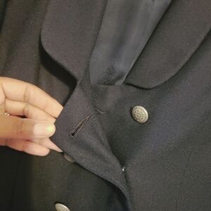 Women's dark blue military style vintage career blazer or suit jacket by Suits Me, size 10. Double breasted. Buttons on sleeves and down front. Front pockets. Blazer can look black to some. Excellent pre-owned vintage condition; no flaws.