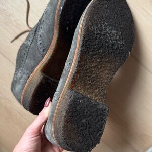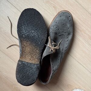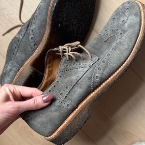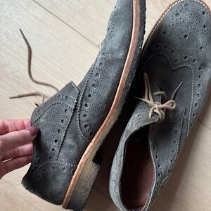 Elegant charcoal suede Oxfords with brogue detailing. Ideal for formal and casual wear.