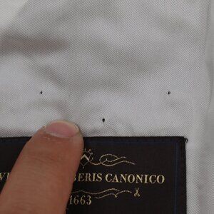 Has a few damages in the fabric on the back another on the right sleeve shoulder and a few smaller pulls on the sleeves