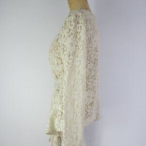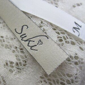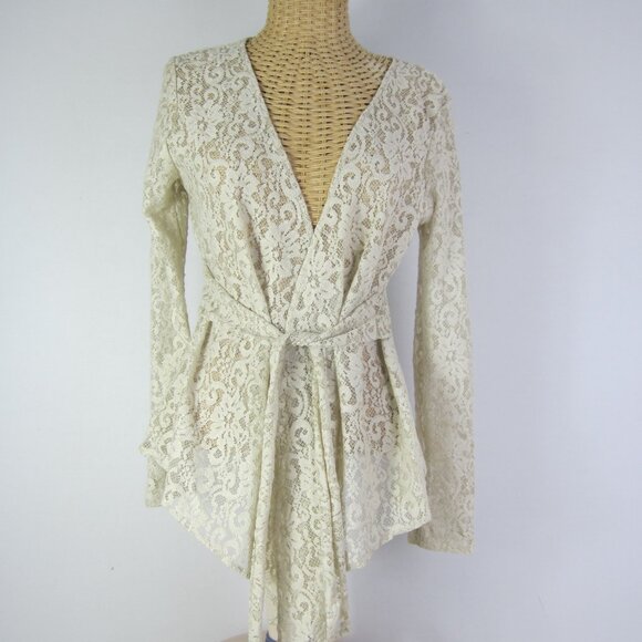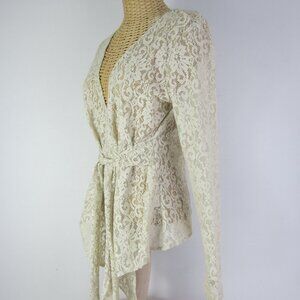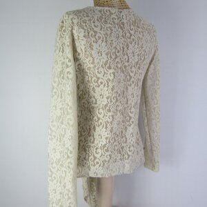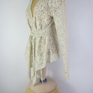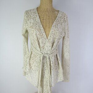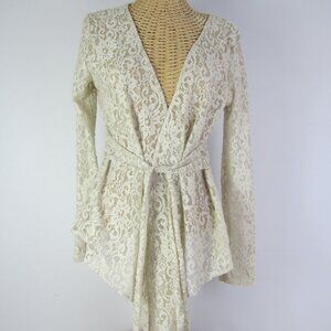 Suki Women M Taupe Ivory Floral Lace Long Sleeve Cardigan Front Ties Made in USA