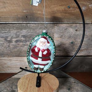 This handblown glass ornament is oval with 3d Santa on the face. Shiny and sparkly. Measures 4" tall x 2 3/4" wide by 1" deep.