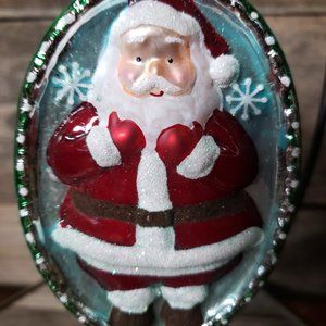 This handblown glass ornament is oval with 3d Santa on the face. Shiny and sparkly. Measures 4" tall x 2 3/4" wide by 1" deep.