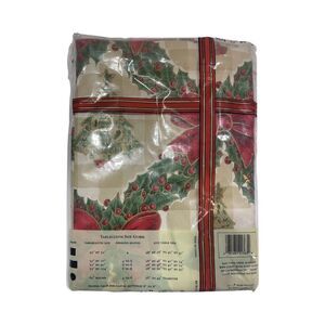 Sultan's Linens Christmas Flannel Back Vinyl Tablecloth 52 X 70 rectangle New Sealed. New old stock, still packaged in original packaging. Decorated with wreaths, bows, Christmas trees and Holly berries.