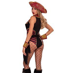 This buccaneer beauty outfit kit includes brocade collared bodysuit, pirate flat belt, wrist cuffs, and brocade pirate hat. Show off that pirate booty in the ultra-sexy cheeky bodysuit with waist defining striped panels and eye-catching gold trim.
